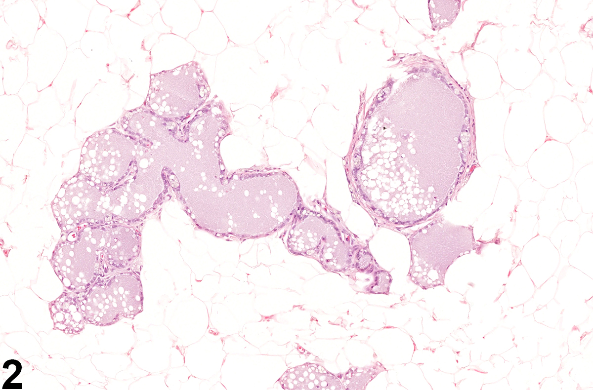 Mammary gland - Dilation in a female F344/N rat from a chronic study. There are scattered ducts and alveoli distended by intraluminal accumulations of amorphous, secretory material.