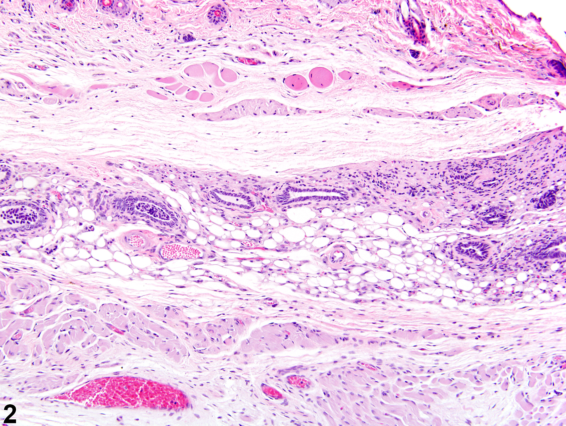 Mammary gland - Normal in a female B6C3F1/N mouse from a chronic study. Normal mammary gland with well-developed mammary fat (adipose) pad.