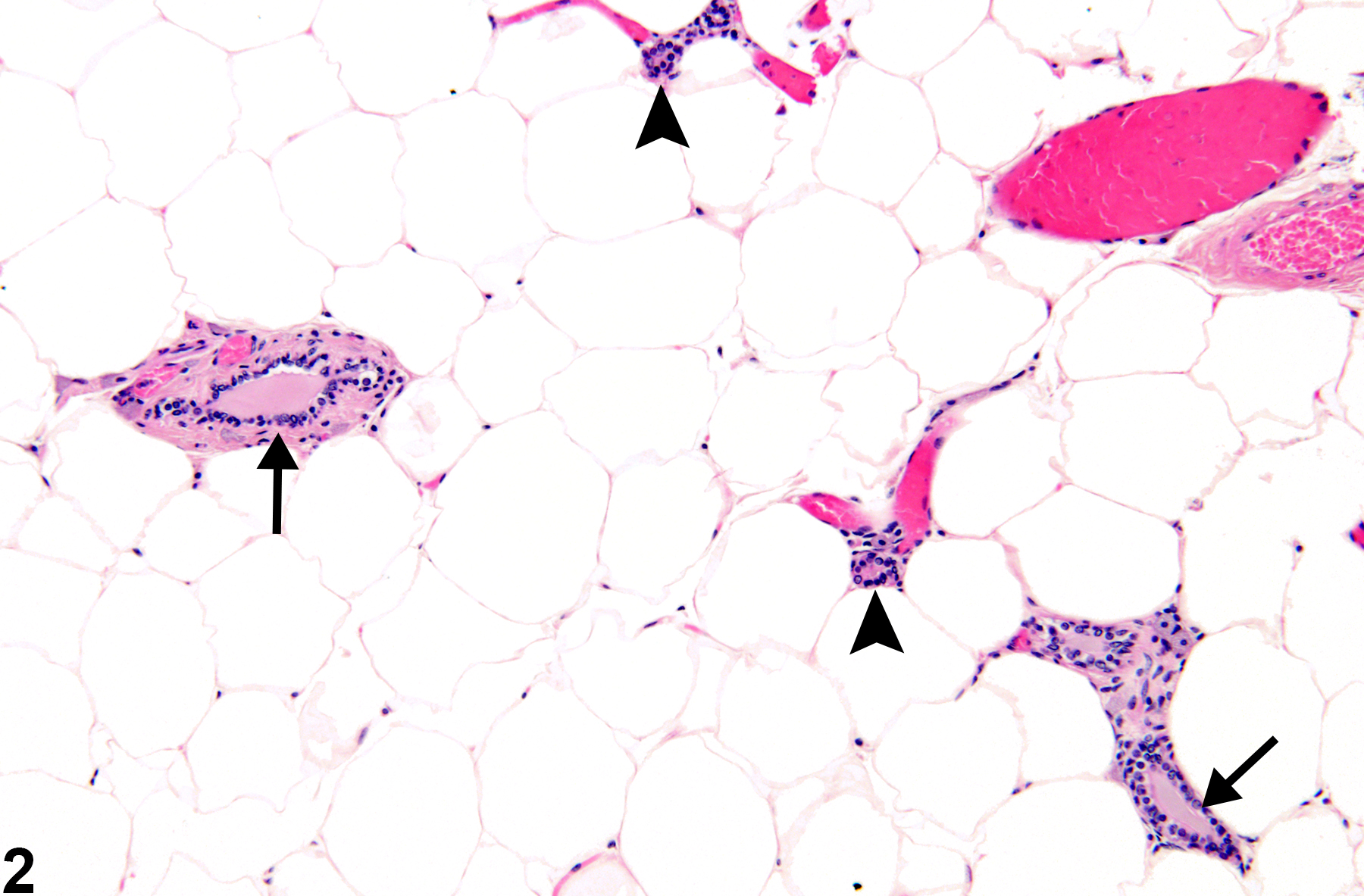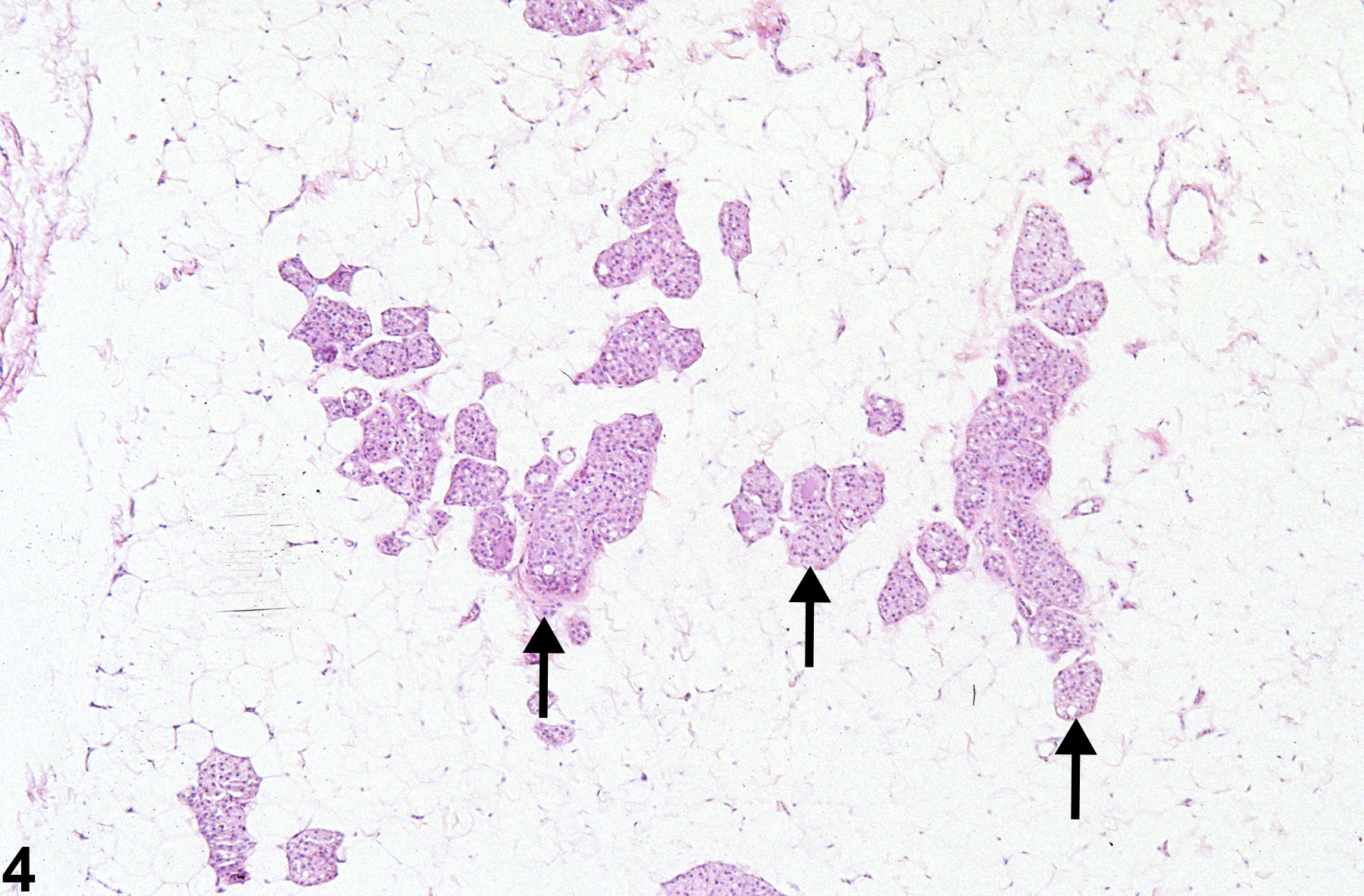 Figure 2. Mammary gland from a female B6C3F1 mouse. Widely separated duct profiles are embedded in abundant adipose tissue. Large ducts (arrows) branch into smaller ducts (arrow heads). Alveoli are rarely observed in histologic section.