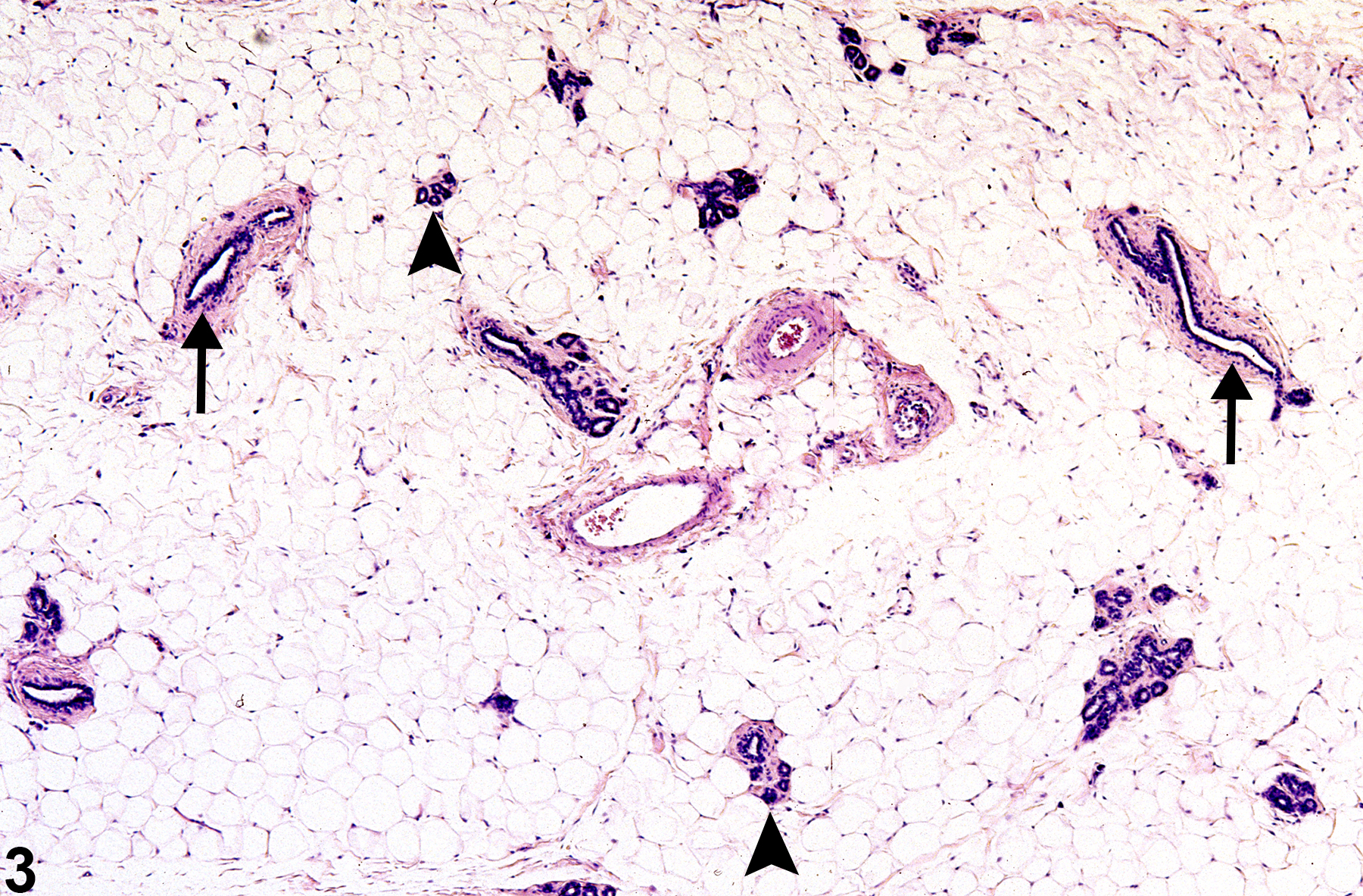 Figure 3. Mammary gland from a female F344/N rat. Ducts (arrows) are the most numerous components of the gland. Lobules of alveoli (arrowheads) are small and less frequently encountered in section.