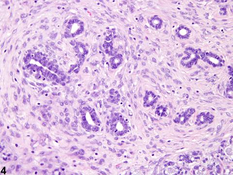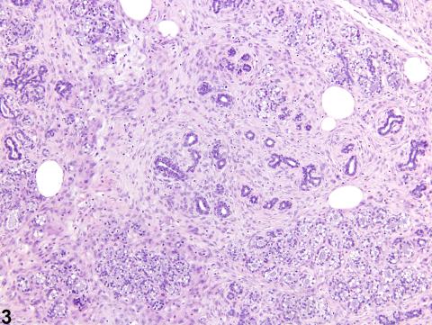 Mammary gland - Fibrosis in a male F344/N rat from a chronic study (higher magnification of Figure 1). Mature fibrous connective tissue surrounds a mammary gland duct and alveoli and extends into the adjacent mammary adipose tissue.