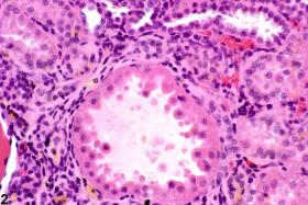 Kidney, Renal tubule - Hypertrophy in a male F344/N rat from a chronic study. These hypertrophied tubular epithelial cells with an increased amount of amorphous, eosinophilic cytoplasm and small, round, dense nuclei are associated with chronic progressive nephropathy.
